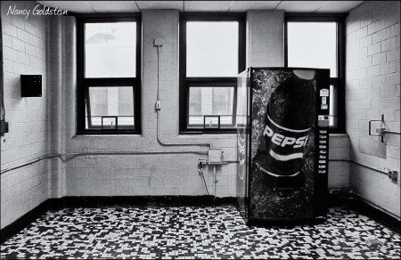 This is the vending area in a building where I used to work. The building dates to 1918, which explains the tile floor, electrical conduits on the walls, and shabby condition of the room. Processing was straightforward: I converted the image to black and white, a vast improvement over the dirty, pale-yellow walls, then boosted the contrast a little to bring out the full range of tones.