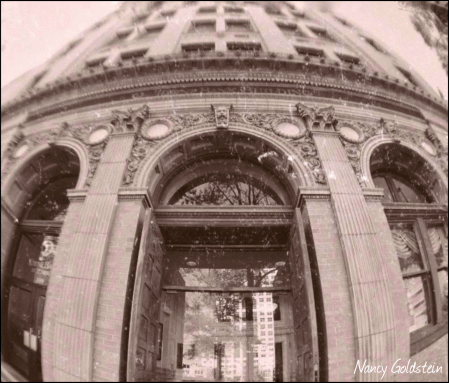The subject of today’s photo is an historic bank building in Norfolk, Virginia. I used a fisheye attachment on my iPhone for the distortion it provided. This is in sepia because it looks far too harsh and modern in black and white.