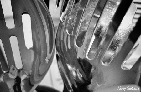 I had to fiddle around a bit more than usual during processing. First, I straightened the horizontals and verticals, then I cropped a little. After converting to black and white I made it look like it was shot on film. Finally, I increased the contrast to bring out the reflections on the brick sidewalk.